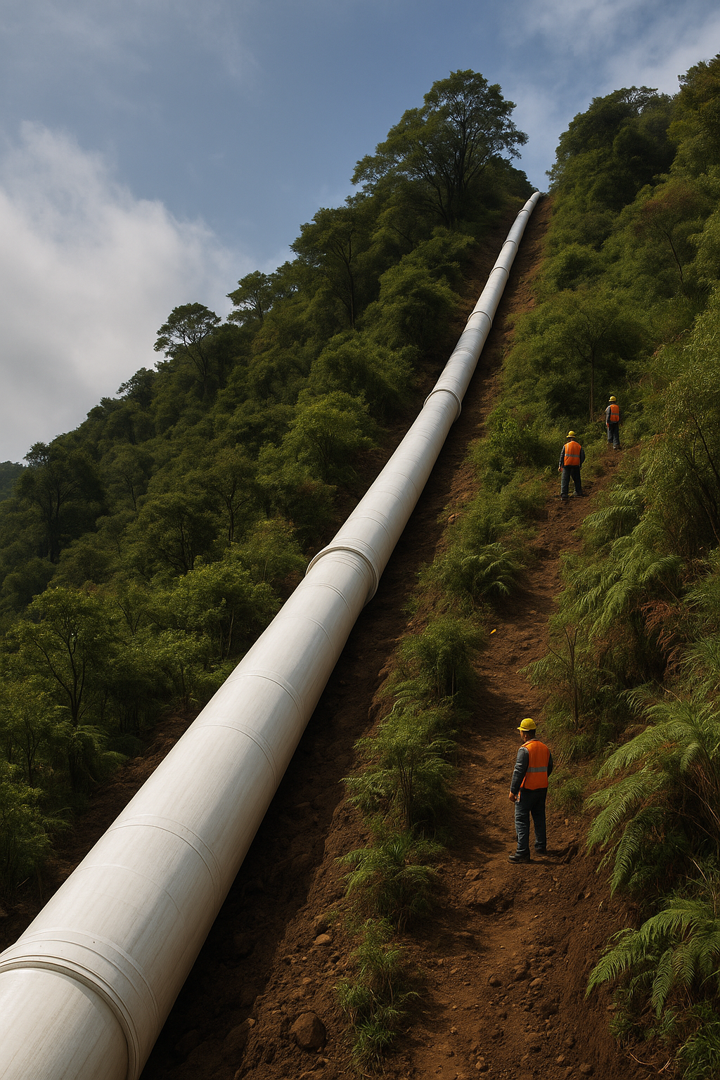 Cliffs, tight corridors, rock cuts, and unstable soils increase installation risk. PN25 combines high pressure class with lighter sections for safer handling, fewer lifts, and faster progress in constrained sites. Specify bedding/embedment to spec, restrained joints at changes in direction, and monitoring during commissioning.